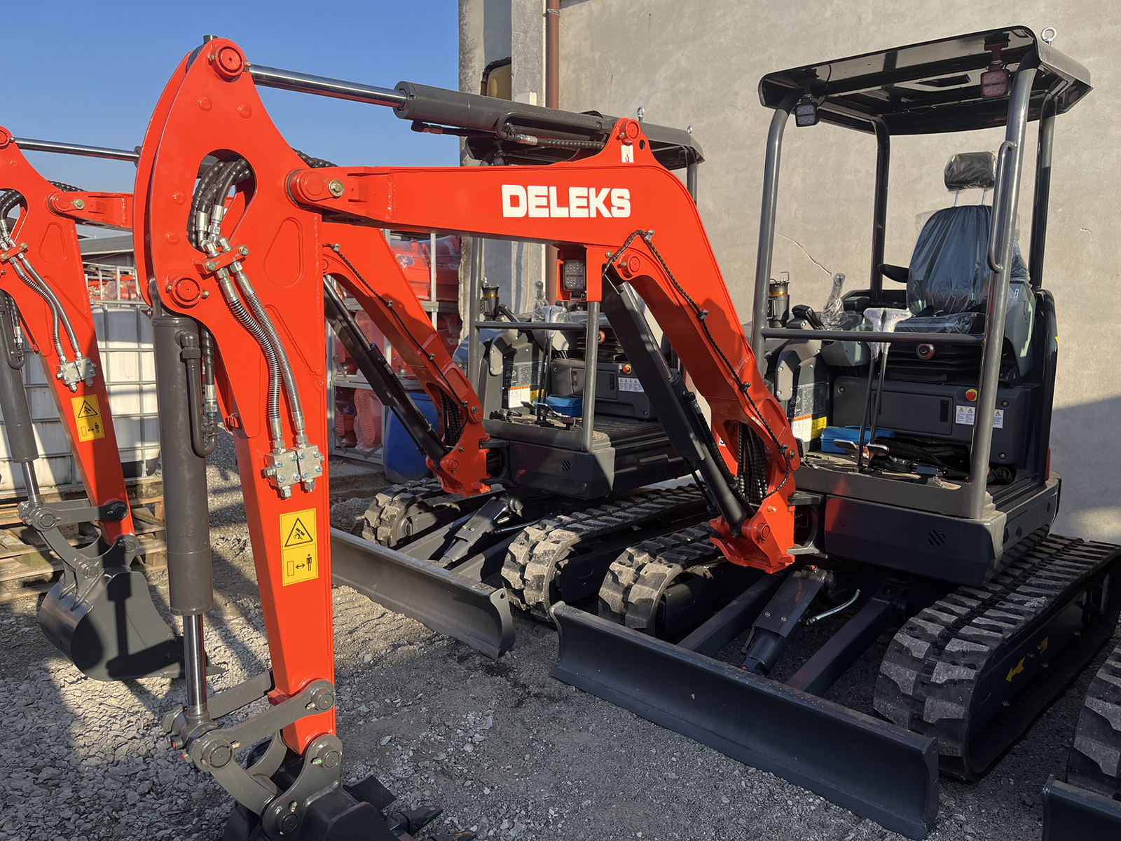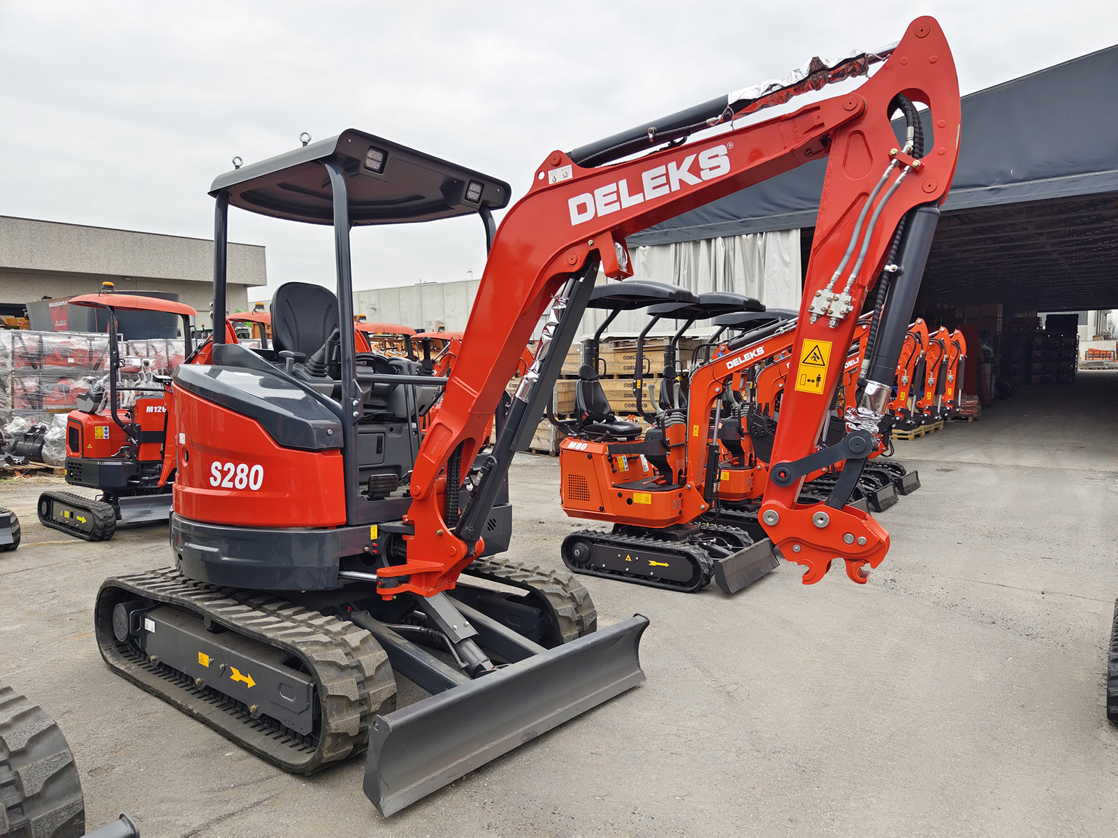 Kompakt minigraver DELEKS® S280-KUBOTA – 2.7 t — Kubota D1105 Stage V 3-cylindret motor (1123 cc), to kørehastigheder op til 4 km/t, hydraulikpumpe med aksiale stempler på 87 L/min med Load Sensing-styring, nul bagudhæng, to hjælpekredse AUX1–AUX2, svingbar bom og sikkerhedsventil iht. ISO 8643.