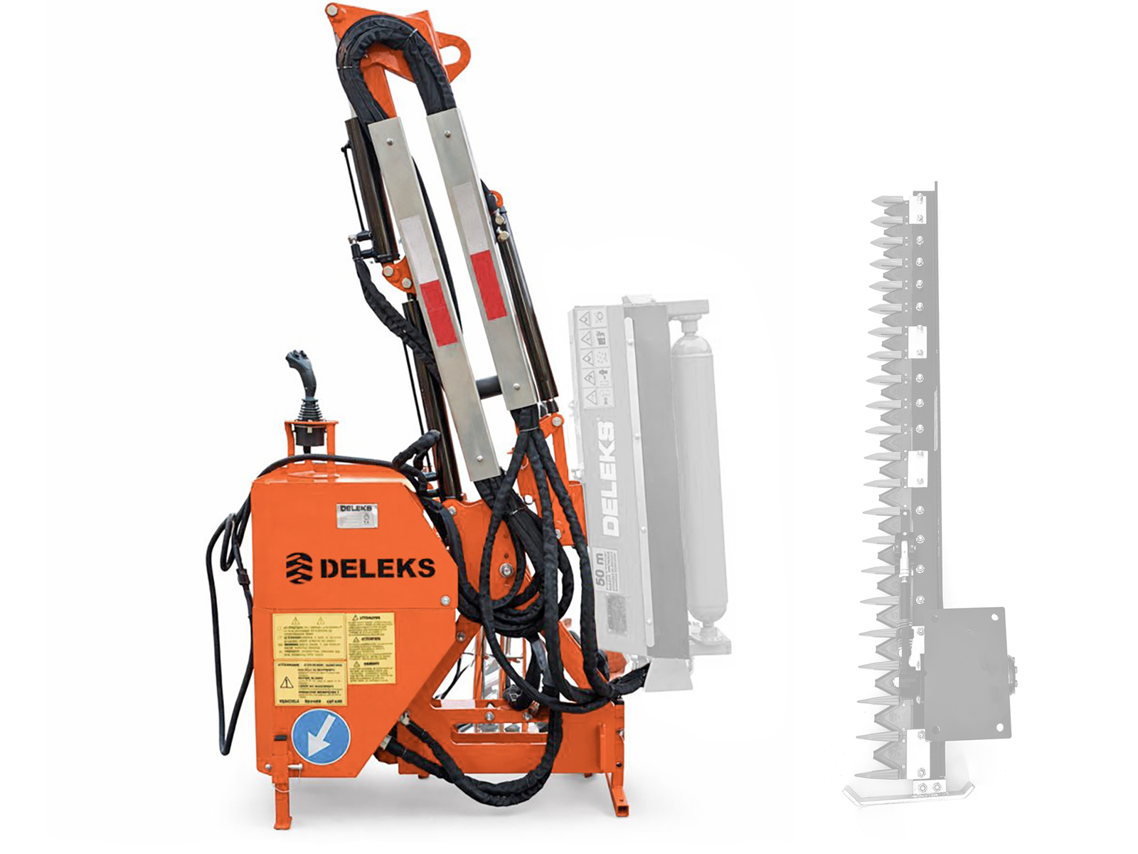 Hydraulisk armklipper, rabatklipper, slagleklipper til traktor DELEKS® AIRONE, kompatibel med traktorer med 3-punktsophæng Kat. 1, forberedt til slagleklippere med arbejdsbredde 60–80–100 cm eller hækkeklippere på 130–160–180 cm.