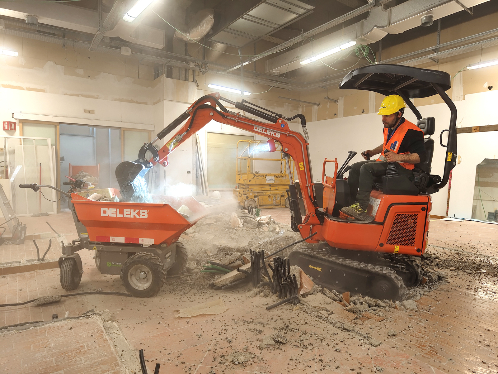 DELEKS® E110, udstyret med DELEKS 350L hydraulisk hammer og standardskovl, samt understøttet af 100 % elektriske DELEKS trillebøre, gjorde det muligt at udføre nedrivning og materialehåndtering sikkert, uden emissioner og med lavt støjniveau.