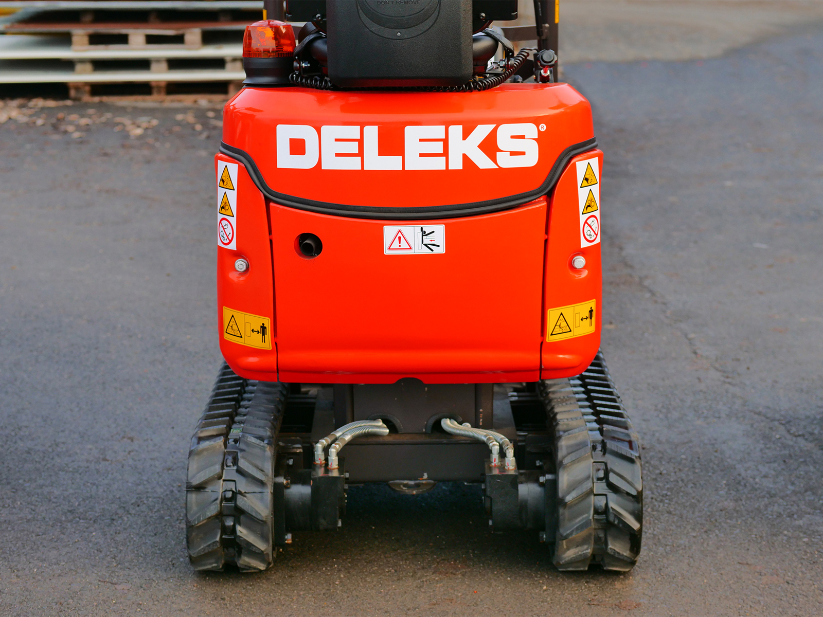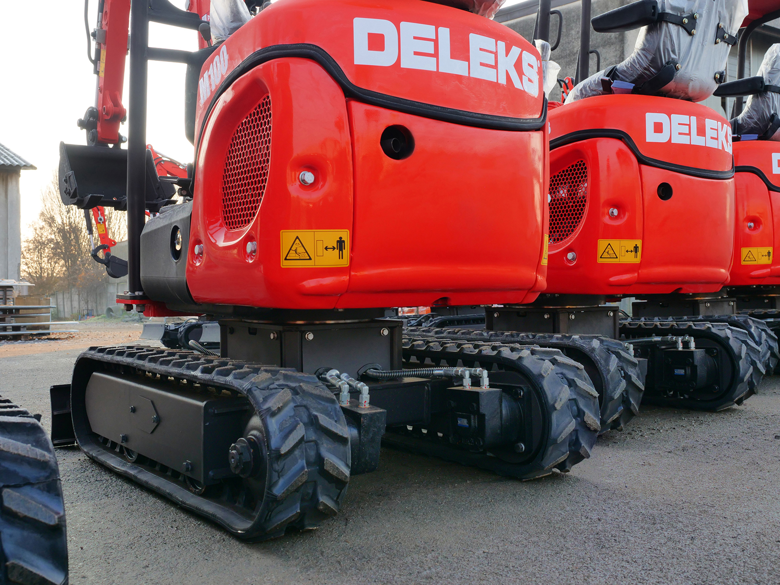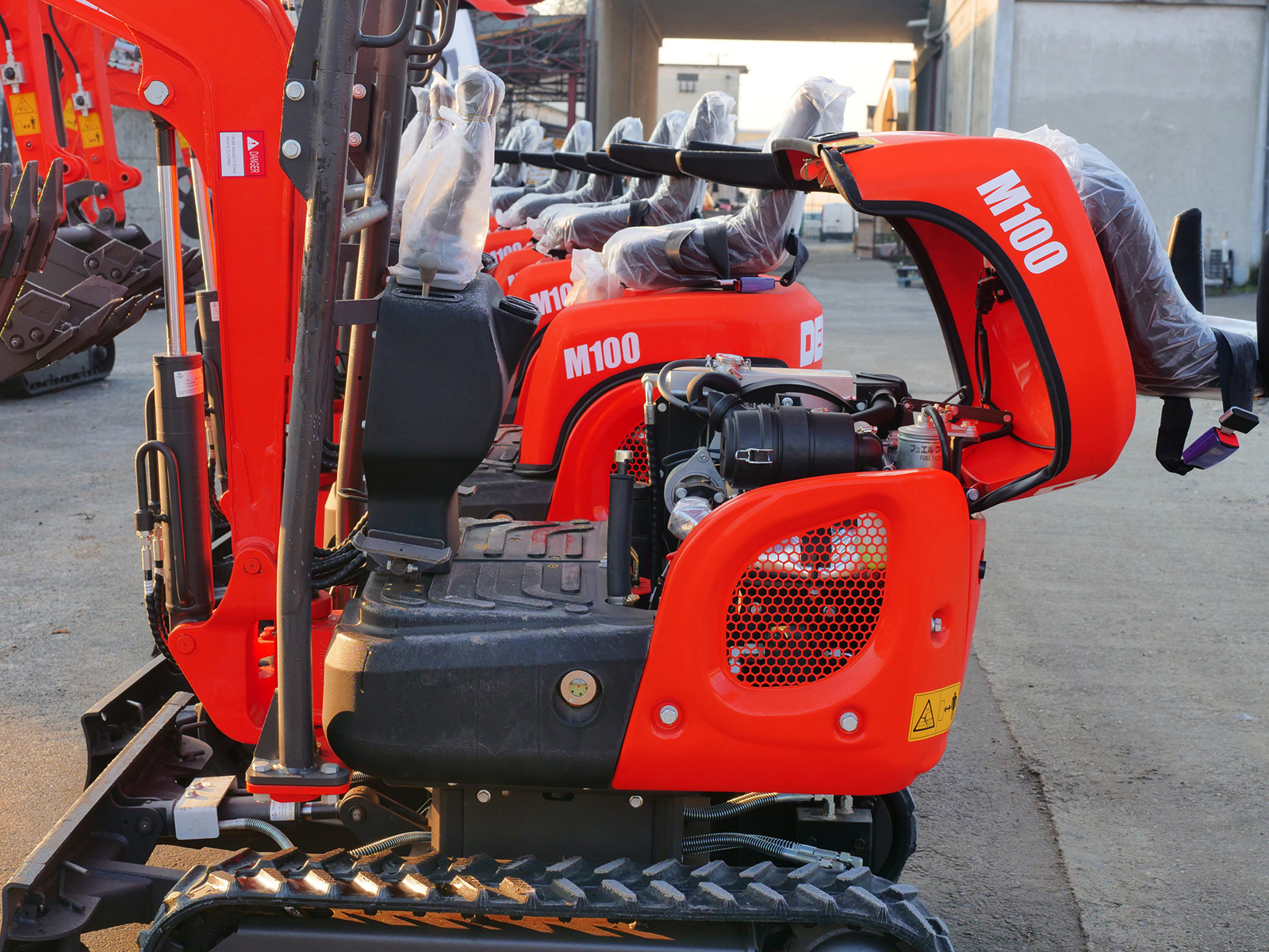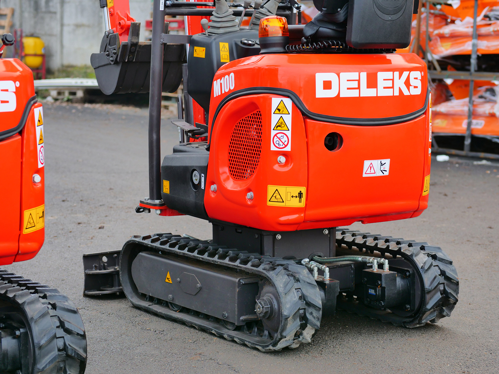 Den kompakte minigraver DELEKS® M100 (1 ton) er udstyret med en Kubota D722 dieselmotor med tre cylindre, et udvideligt undervognssystem og en svingbar bom.
