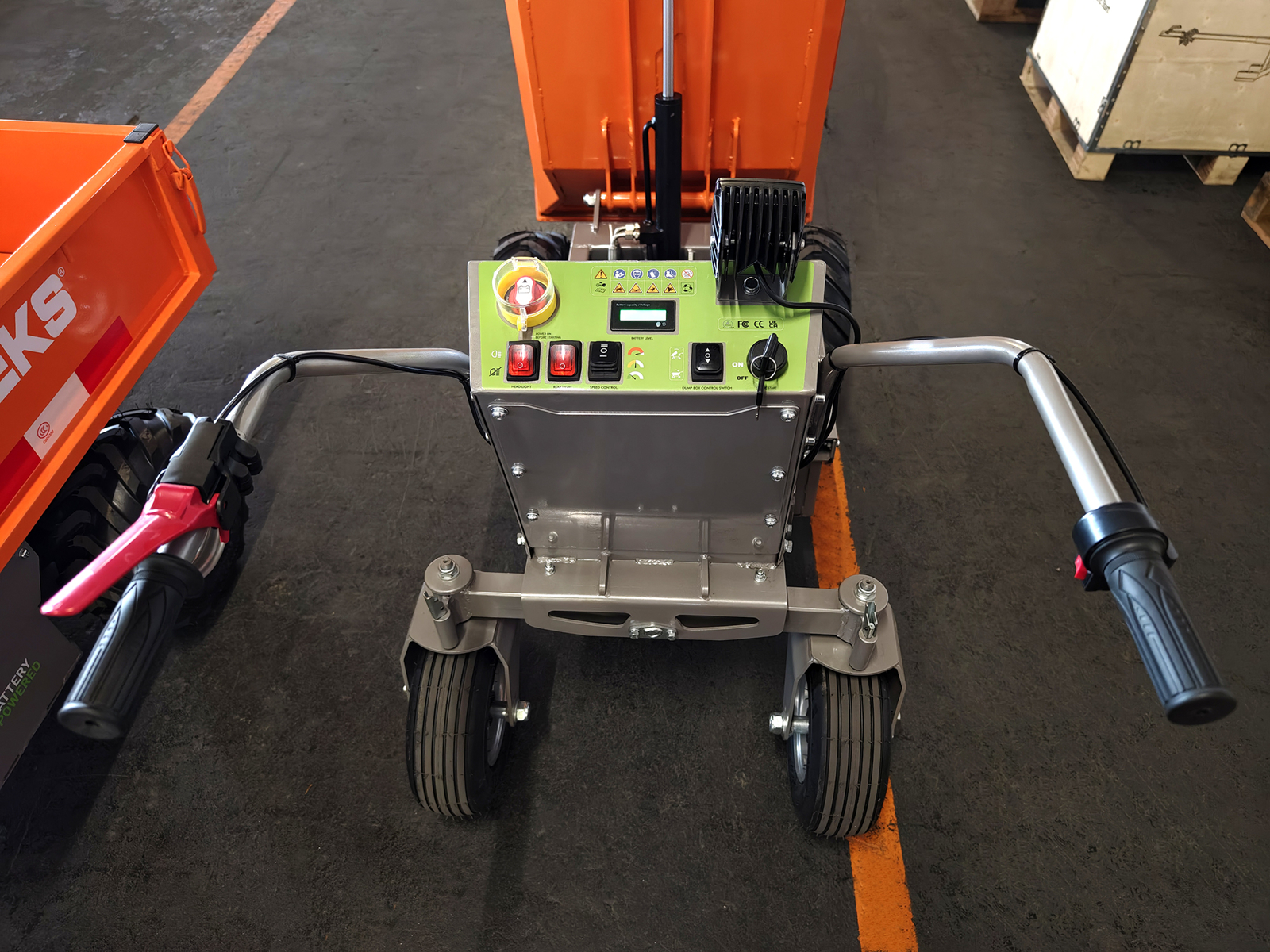 The electric wheelbarrow is supplied with 4*12V / 32Ah lead batteries for an autonomy of about 10-12 hours, depending on the type of use.