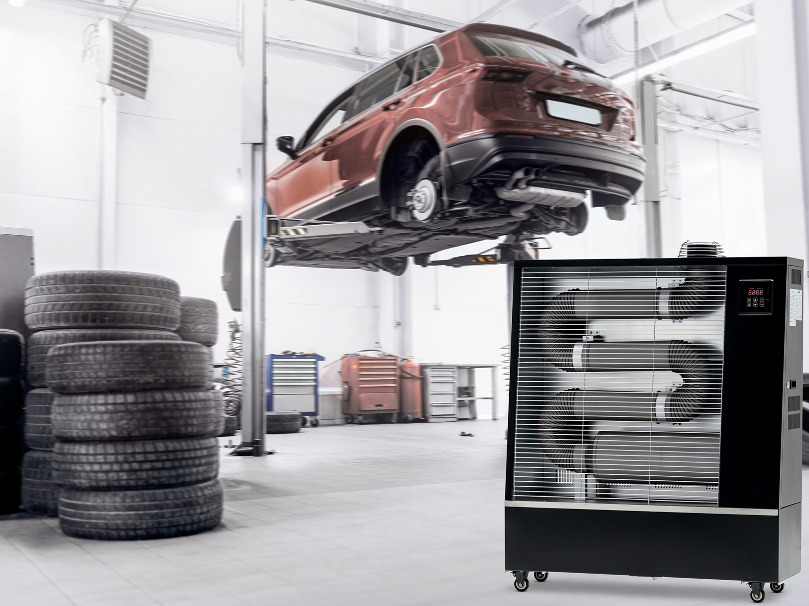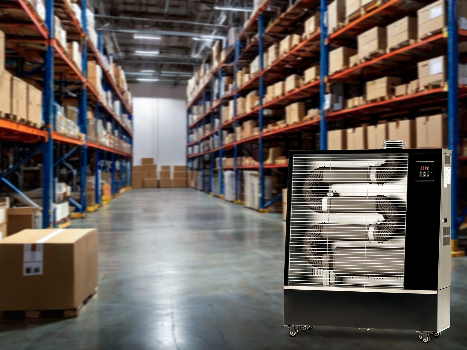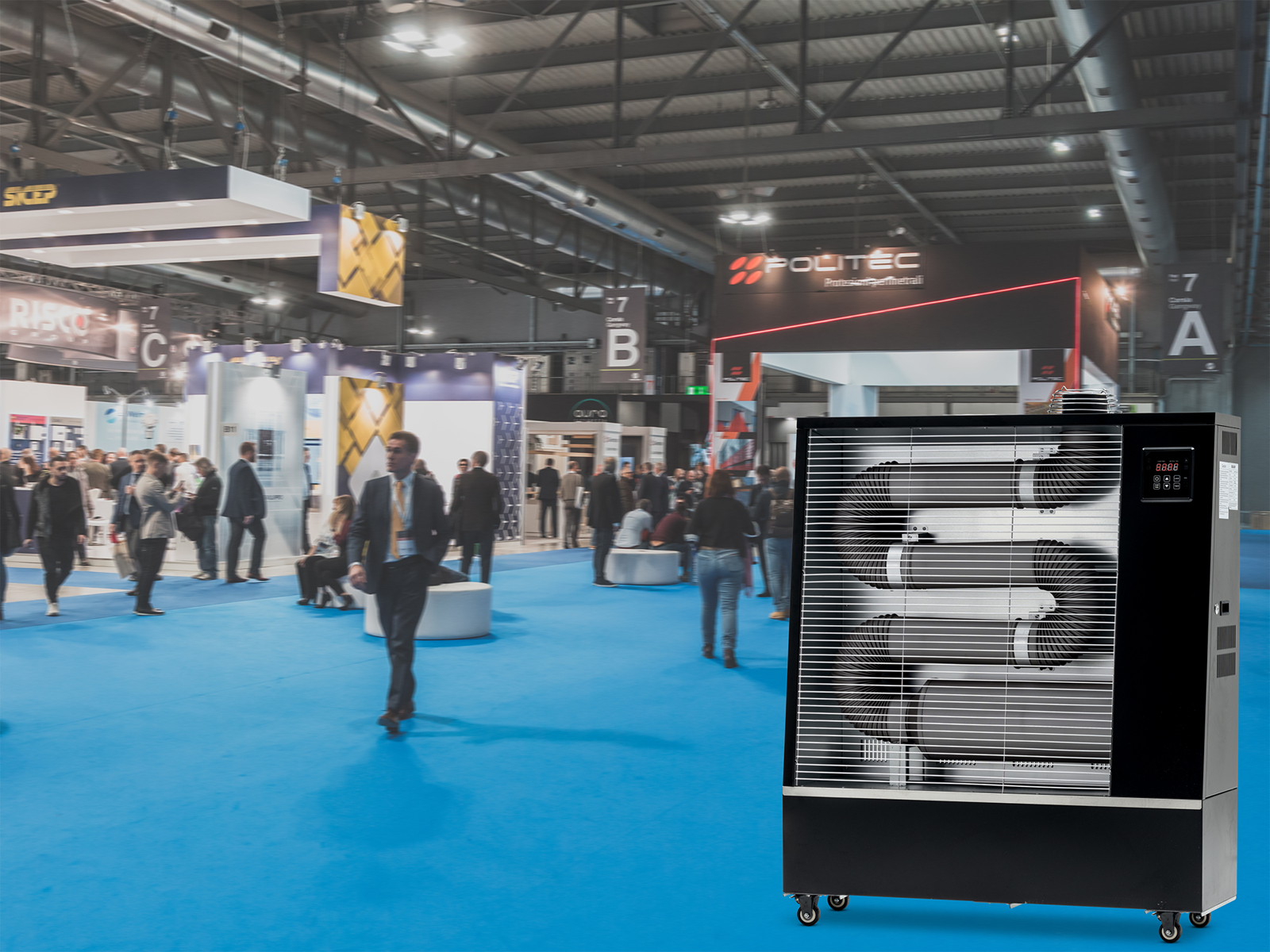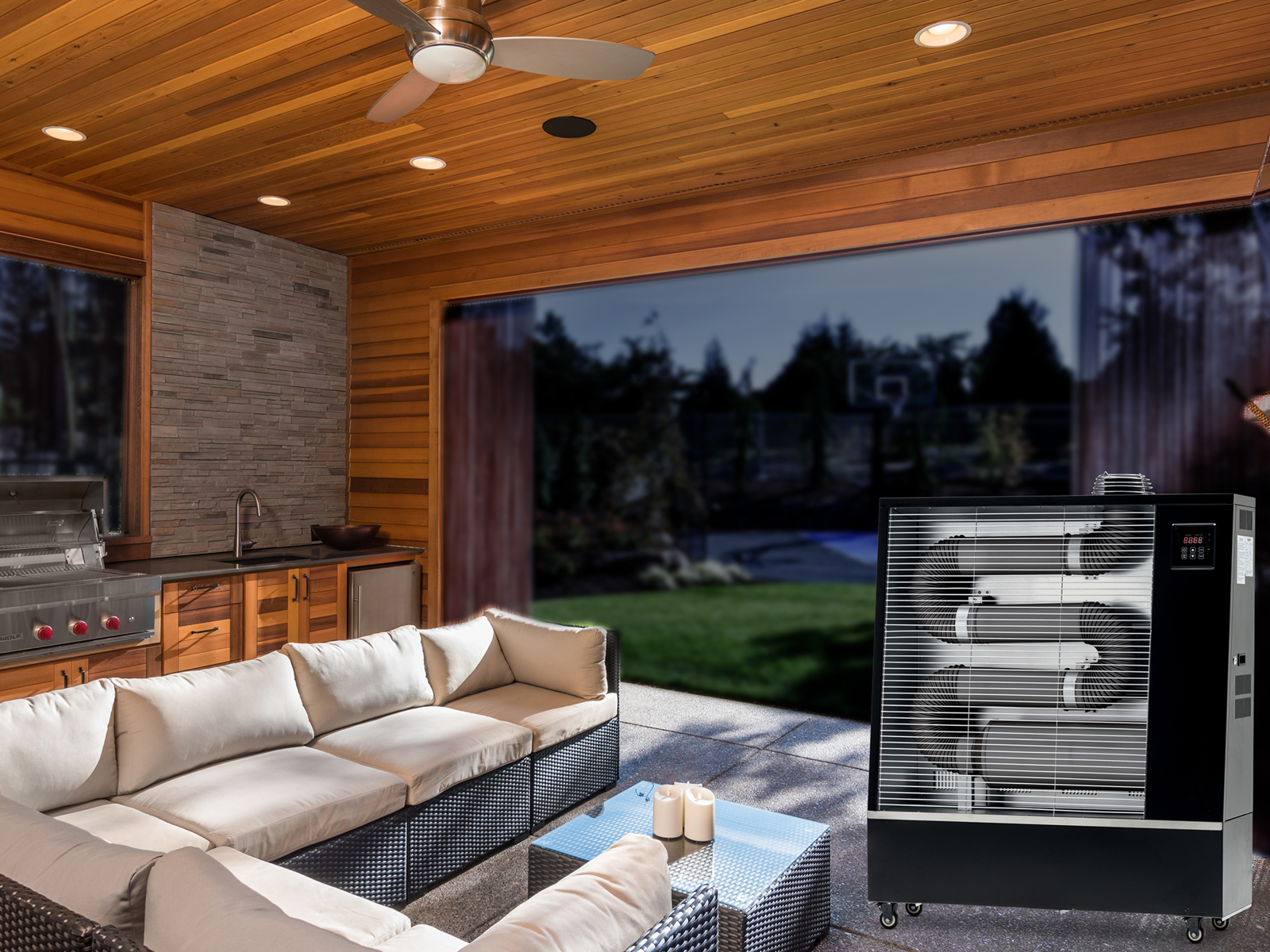 Innovative heating system for ventilated closed spaces (mechanical workshops, commercial, industrial, agricultural areas, warehouses, gyms) and outdoors such as greenhouses, terraces, construction sites...