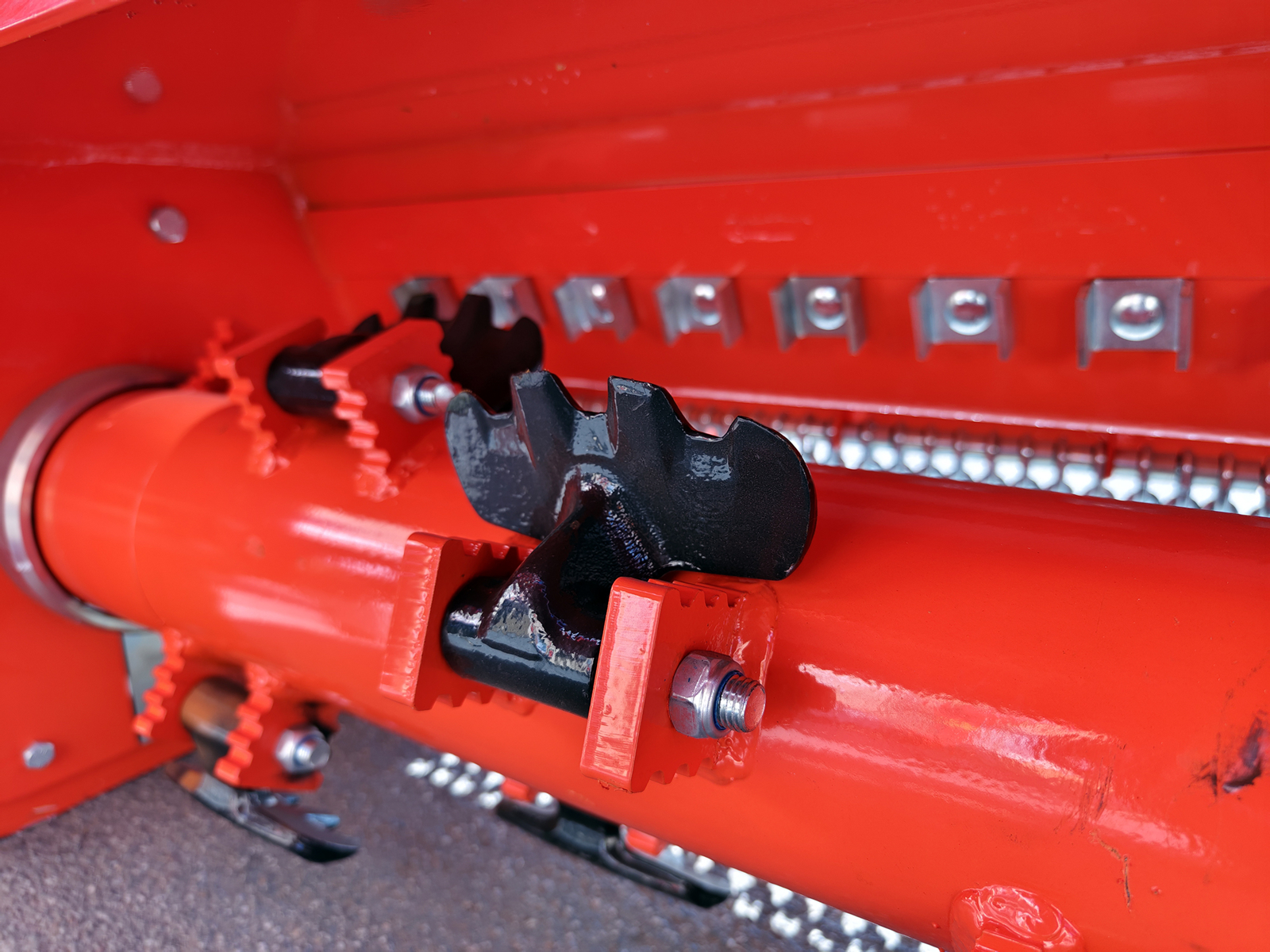 The supports that house the hammers' pins are welded onto the rotor following a double helix. The shape of these supports is toothed, so that, when chopping large swaths or large branches, when the hammers move back due to the blows received, these supports compensate for the momentary absence of the hammers' cut and contribute to the pulverisation of the woody material.