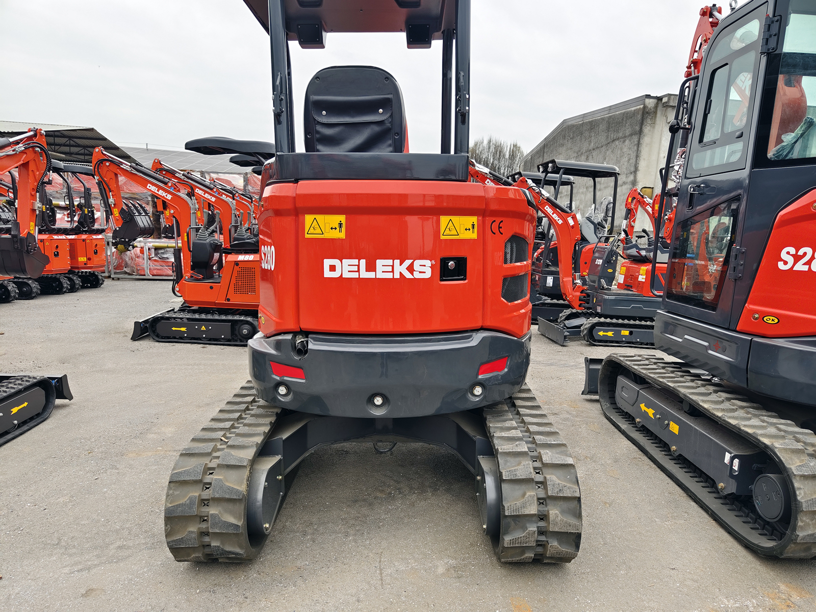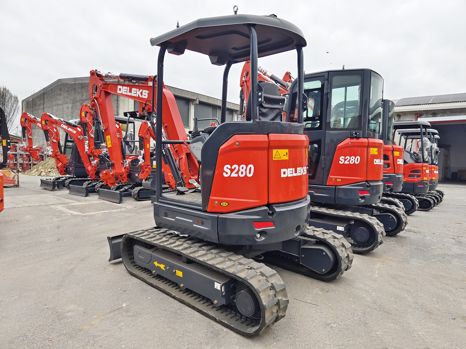 CLOSECompact mini excavator DELEKS® S280-KUBOTA – 2.7 t — Kubota D1105 Stage V 3-cylinder engine (1123 cc), dual travel speed up to 4 km/h, 87 L/min axial piston hydraulic pump with Load Sensing control, zero tail swing, two auxiliary circuits AUX1–AUX2, offset boom and ISO 8643 safety valve.
