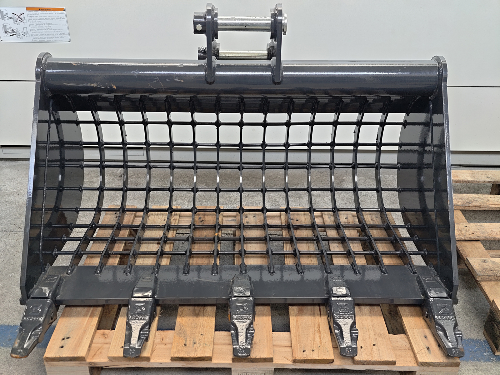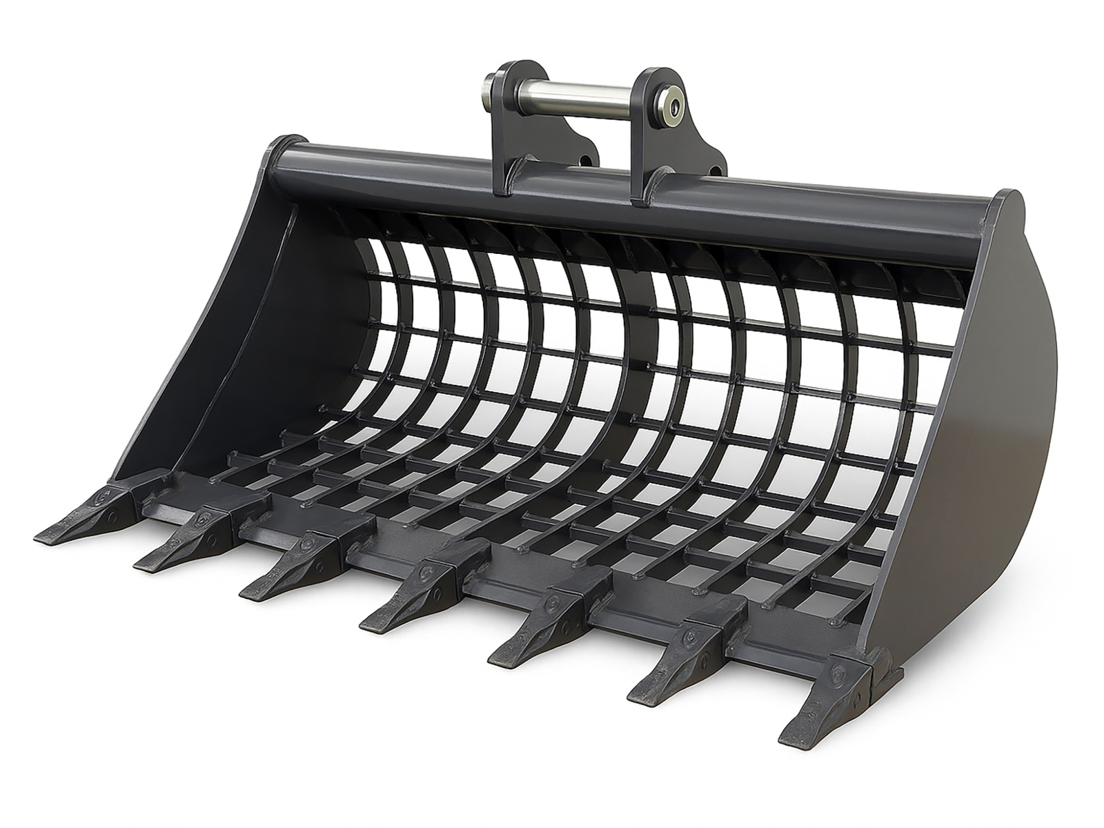 The reinforced open-grid structure, made of high-strength vertical bars, ensures excellent screening capacity and rapid discharge of fine material, reducing waste and allowing reuse of the screened soil fraction.
