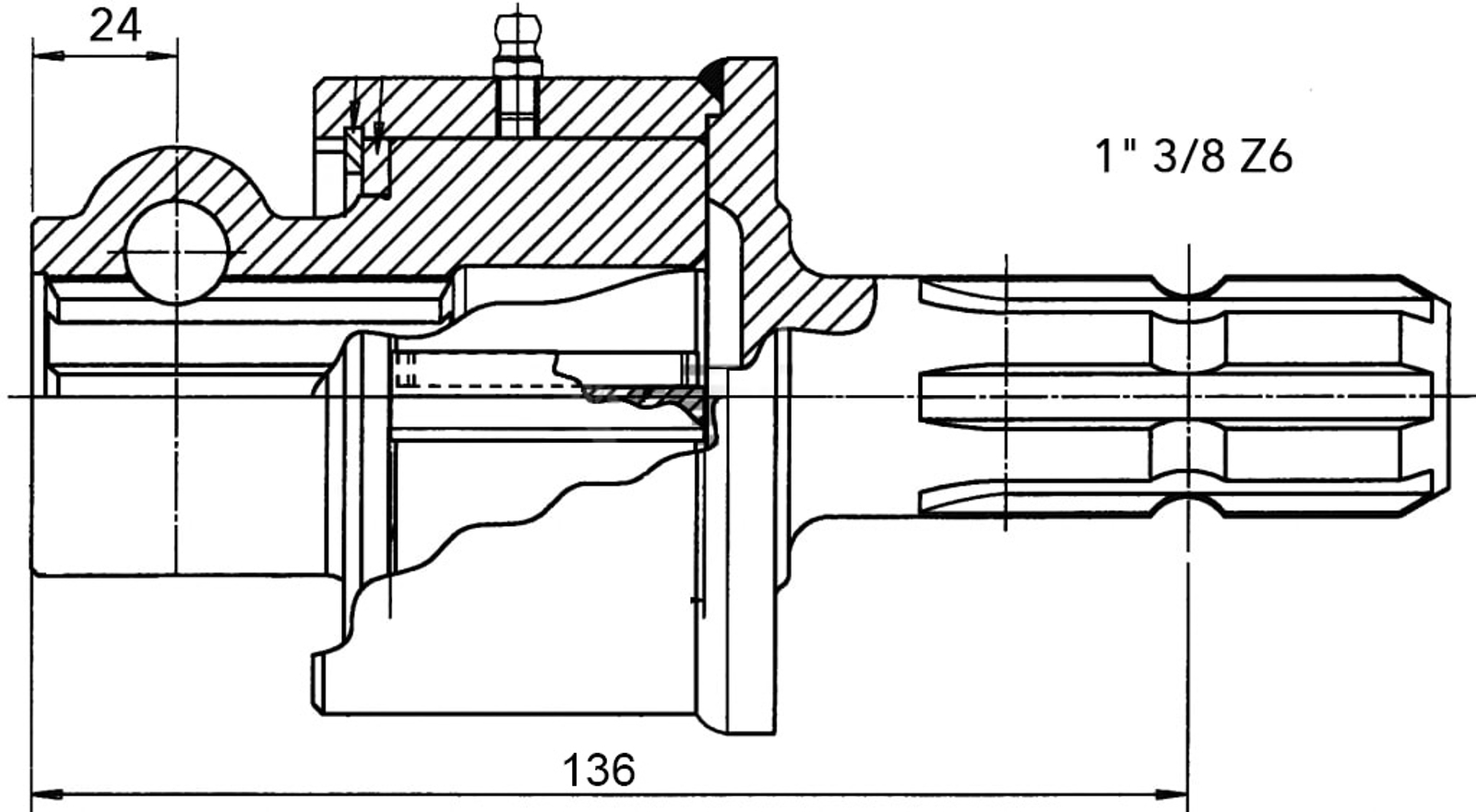 Clutch has female to male 1 3/8" x 6 spline