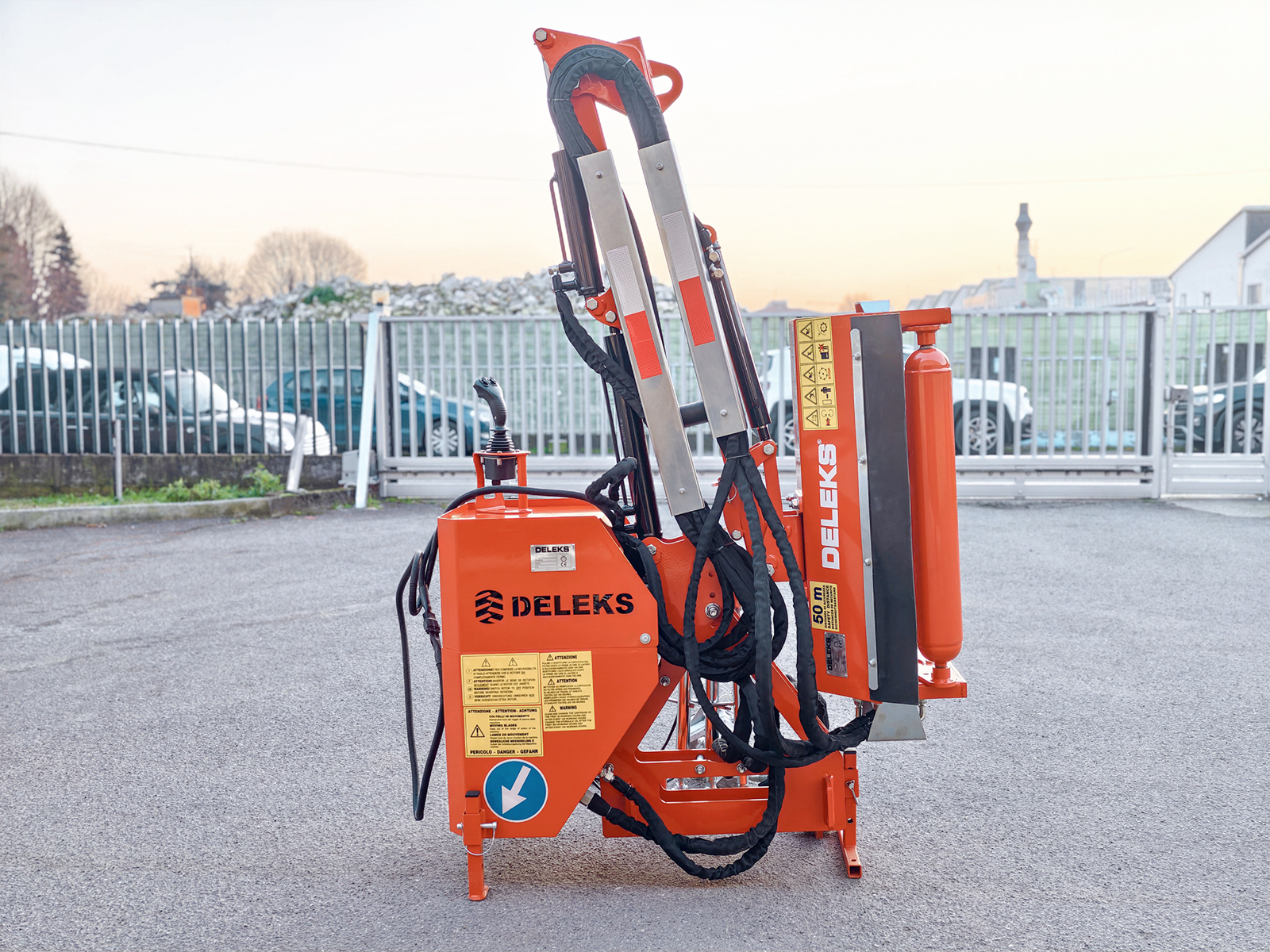 CLOSEHydraulic mounted Hedgecutter for tractor DELEKS® AIRONE, multiple hedge and grass verge rear arm cutter compatible with tractors with 3-point hitch Cat. 1, designed for flail mower heads of 60–80–100 cm or hedge cutter bars of 130–160–180 cm. Control joystick and PTO pump included.