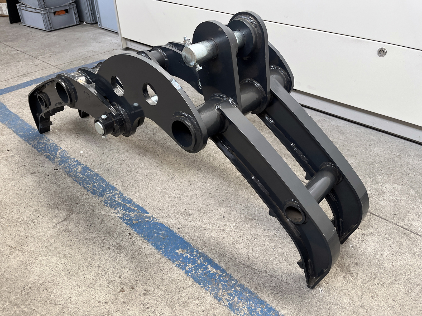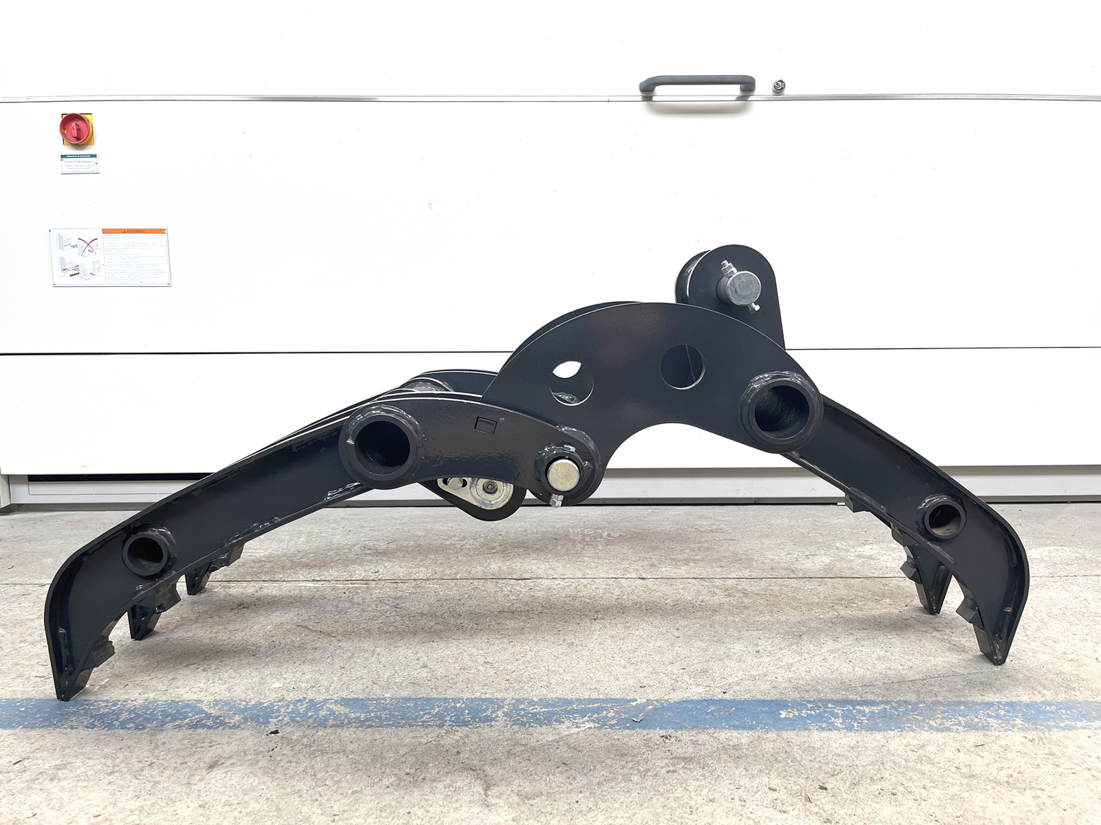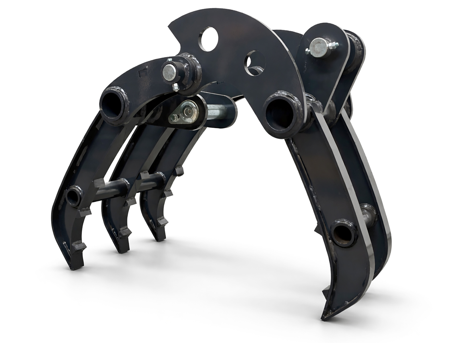 Grapple for S380 mini excavators, built from high-strength structural steel, featuring a single-actuator mechanism and shaped jaws for handling compact materials. The connection to the boom is made via two Ø40 mm pins with grease fittings, or through the S380 mechanical quick coupler. Engineered to ensure high torsional rigidity and resistance to the stresses generated during handling of irregular loads.