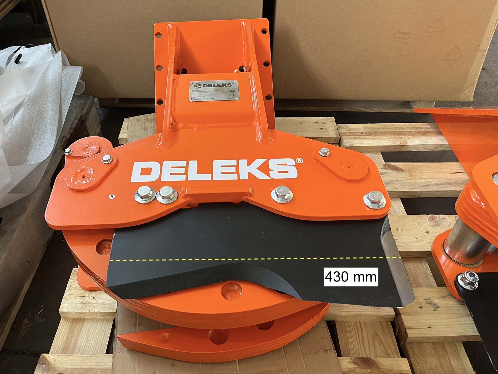 The DELEKS® mini-excavator hydraulic shear is capable of cutting trees or bunching thinner woods together with the grab for cutting. The shear has a powerful hardened blade that will cleanly and safely cut through timber.
